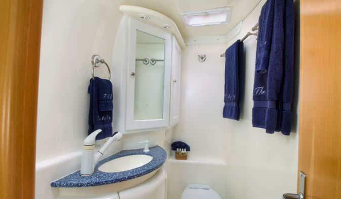 (4) guest staterooms, each with full A/C, flat screen TV, Apple TV & stereo, private ensuite bath with electric toilets and stall showers. Midships cabin is a wet head.